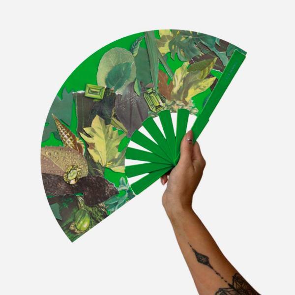 Su estructura contiene 8 varillas de plástico reciclado flexible, es ultraliviano (30gr), apto para mojarse, y de calidad premium. Incluye grabado UV como certificado de obra de collage aplicado sobre tela del abanico con la marca y pulsera de agarre.