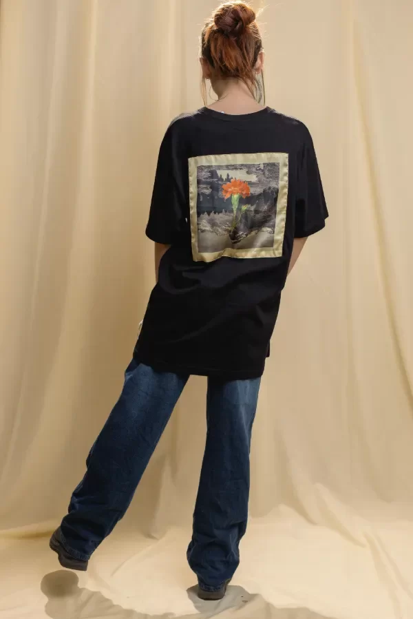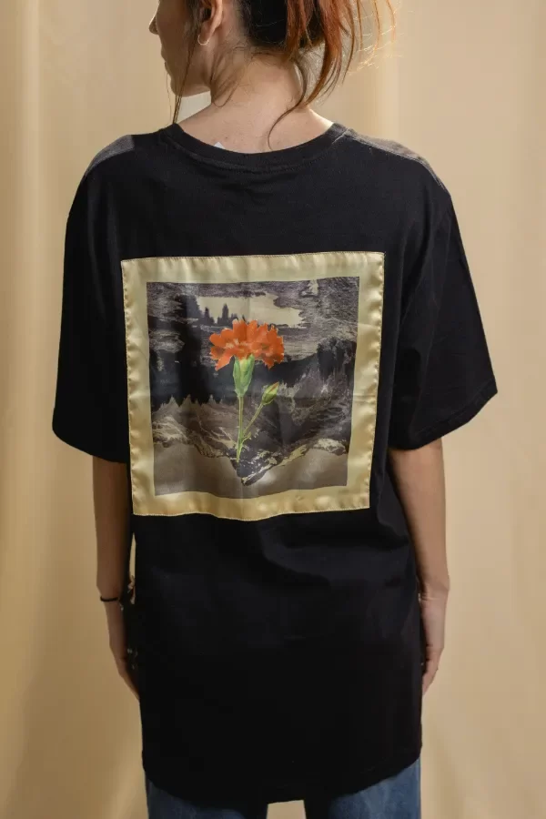Remera negra de algodon 100% con obra de collage sobre satén dorado cosido en la espalda.