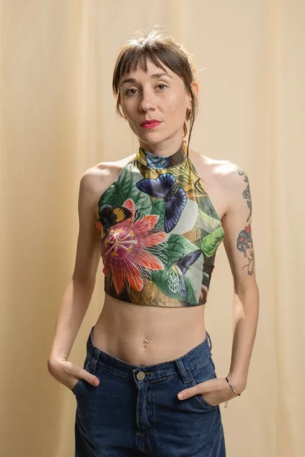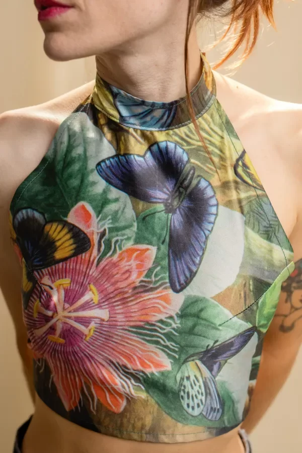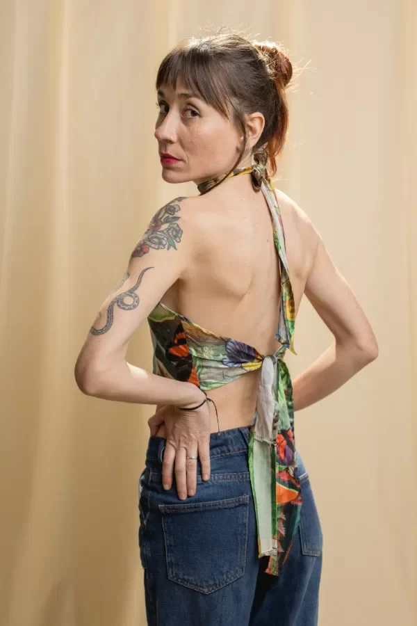 Top con atadura a cuello y cintura de saten estampado con obra de collage.